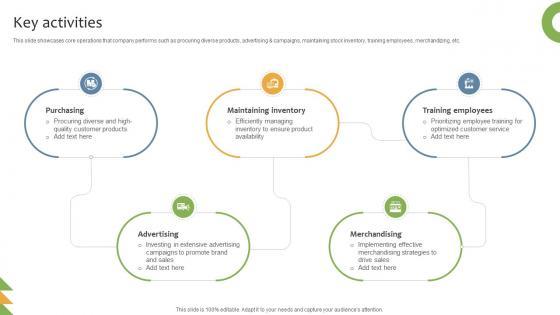 This slide showcases core operations that company performs such as procuring diverse products, advertising and campaigns, maintaining stock inventory, training employees, merchandizing, etc. Explore a selection of the finest Key Activities General Merchandising Store Business Model BMC SS V here. With a plethora of professionally designed and pre-made slide templates, you can quickly and easily find the right one for your upcoming presentation. You can use our Key Activities General Merchandising Store Business Model BMC SS V to effectively convey your message to a wider audience. Slidegeeks has done a lot of research before preparing these presentation templates. The content can be personalized and the slides are highly editable. Grab templates today from Slidegeeks. This slide showcases core operations that company performs such as procuring diverse products, advertising and campaigns, maintaining stock inventory, training employees, merchandizing, etc.