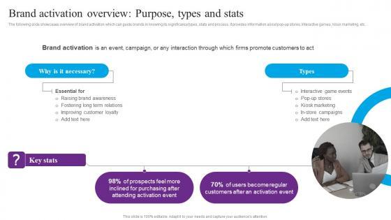 The following slide showcases overview of brand activation which can guide brands in knowing its significance types, stats and process. It provides information about pop-up stores, interactive games, kiosk marketing, etc. Here you can discover an assortment of the finest PowerPoint and Google Slides templates. With these templates, you can create presentations for a variety of purposes while simultaneously providing your audience with an eye catching visual experience. Download Brand Activation Overview Purpose Types And Stats Template PDF to deliver an impeccable presentation. These templates will make your job of preparing presentations much quicker, yet still, maintain a high level of quality. Slidegeeks has experienced researchers who prepare these templates and write high quality content for you. Later on, you can personalize the content by editing the Brand Activation Overview Purpose Types And Stats Template PDF