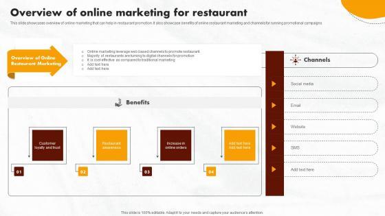 This slide showcases overview of online marketing that can help in restaurant promotion. It also showcase benefits of online restaurant marketing and channels for running promotional campaigns Are you searching for a Online Promotional Activities Overview Of Online Marketing For Restaurant Brochure Pdf that is uncluttered, straightforward, and original It is easy to edit, and you can change the colors to suit your personal or business branding. For a presentation that expresses how much effort you have put in, this template is ideal With all of its features, including tables, diagrams, statistics, and lists, it is perfect for a business plan presentation. Make your ideas more appealing with these professional slides. Download Online Promotional Activities Overview Of Online Marketing For Restaurant Brochure Pdf from Slidegeeks today. This slide showcases overview of online marketing that can help in restaurant promotion. It also showcase benefits of online restaurant marketing and channels for running promotional campaigns