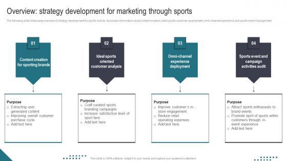 The following slide showcases overview of strategy development for sports brands. It provides information about content creation, ideal sports customer assessment, omni-channel experience and sports event management. Here you can discover an assortment of the finest PowerPoint and Google Slides templates. With these templates, you can create presentations for a variety of purposes while simultaneously providing your audience with an eye-catching visual experience. Download Overview Strategy Development For Marketing Athletic Activities Advertising Program Diagrams Pdf to deliver an impeccable presentation. These templates will make your job of preparing presentations much quicker, yet still, maintain a high level of quality. Slidegeeks has experienced researchers who prepare these templates and write high-quality content for you. Later on, you can personalize the content by editing the Overview Strategy Development For Marketing Athletic Activities Advertising Program Diagrams Pdf. The following slide showcases overview of strategy development for sports brands. It provides information about content creation, ideal sports customer assessment, omni-channel experience and sports event management.