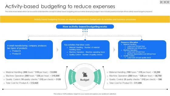 This slide shows details which can be used to understand the concept of activity-based budgeting and use it while developing budget. It also includes practical example of how activity-based budget is prepared. Find a pre-designed and impeccable Activity Based Budgeting To Reduce Expenses Effective And Efficient Tools To Develop Fin SS V. The templates can ace your presentation without additional effort. You can download these easy-to-edit presentation templates to make your presentation stand out from others. So, what are you waiting for Download the template from Slidegeeks today and give a unique touch to your presentation. This slide shows details which can be used to understand the concept of activity-based budgeting and use it while developing budget. It also includes practical example of how activity-based budget is prepared.