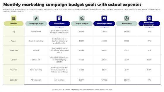 Following slide demonstrates monthly campaign budget target plan which can be used by business to increase customer engagement rate. It includes campaigns such as social media, content marketing, website, banner ads, email marketing, advertisement, etc. Showcasing this set of slides titled Monthly Marketing Campaign Budget Goals With Actual Expenses Inspiration Pdf. The topics addressed in these templates are Months, Campaign Type, Description, Target Budget. All the content presented in this PPT design is completely editable. Download it and make adjustments in color, background, font etc. as per your unique business setting. Following slide demonstrates monthly campaign budget target plan which can be used by business to increase customer engagement rate. It includes campaigns such as social media, content marketing, website, banner ads, email marketing, advertisement, etc.