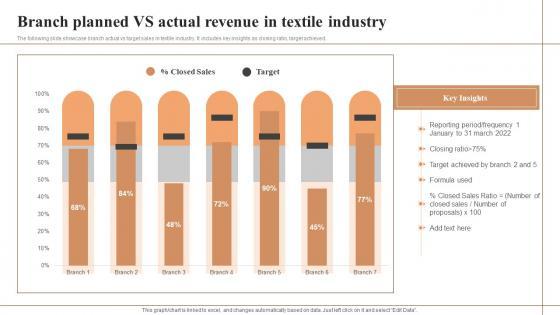 The following slide showcase branch actual vs target sales in textile industry. It includes key insights as closing ratio, target achieved. Showcasing this set of slides titled Branch Planned Vs Actual Revenue In Textile Industry Formats Pdf The topics addressed in these templates are Branch Planned, Actual Revenue, Textile Industry All the content presented in this PPT design is completely editable. Download it and make adjustments in color, background, font etc. as per your unique business setting. The following slide showcase branch actual vs target sales in textile industry. It includes key insights as closing ratio, target achieved.