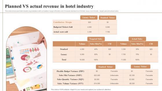 This slide showcase hotel industry segmentation with cumulative margin of tickets sold. It include standard room tickets, luxury room tickets, target sale and actual sales. Showcasing this set of slides titled Planned Vs Actual Revenue In Hotel Industry Icons Pdf The topics addressed in these templates are Budgeted Tickets, Standard Ticket, Hotel Industry All the content presented in this PPT design is completely editable. Download it and make adjustments in color, background, font etc. as per your unique business setting. This slide showcase hotel industry segmentation with cumulative margin of tickets sold. It include standard room tickets, luxury room tickets, target sale and actual sales.