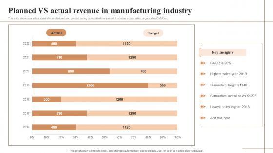 This slide showcase actual sales of manufactured end product during cumulative time period. It includes actual sales, target sales, CAGR etc. Showcasing this set of slides titled Planned Vs Actual Revenue In Manufacturing Industry Graphics Pdf The topics addressed in these templates are Planned VS Actual, Revenue In Manufacturing, Industry All the content presented in this PPT design is completely editable. Download it and make adjustments in color, background, font etc. as per your unique business setting. This slide showcase actual sales of manufactured end product during cumulative time period. It includes actual sales, target sales, CAGR etc.
