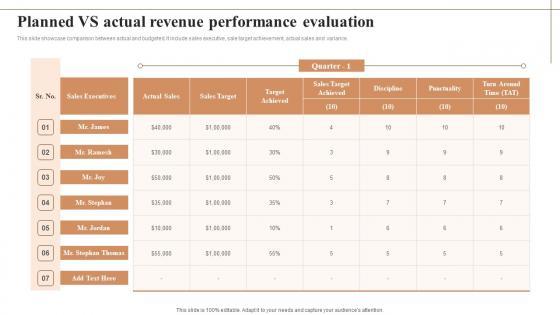 This slide showcase comparison between actual and budgeted. It include sales executive, sale target achievement, actual sales and variance. Pitch your topic with ease and precision using this Planned Vs Actual Revenue Performance Evaluation Icons Pdf This layout presents information on Sales Executives, Actual Sales, Sales Target It is also available for immediate download and adjustment. So, changes can be made in the color, design, graphics or any other component to create a unique layout. This slide showcase comparison between actual and budgeted. It include sales executive, sale target achievement, actual sales and variance.
