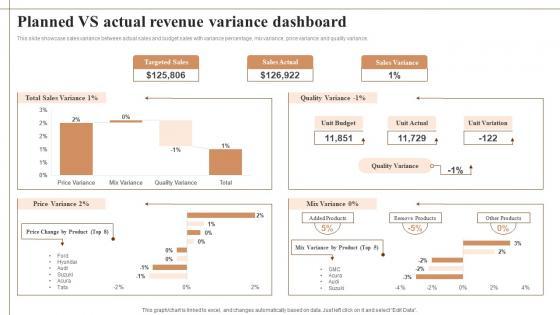 This slide showcase sales variance between actual sales and budget sales with variance percentage, mix variance, price variance and quality variance. Showcasing this set of slides titled Planned Vs Actual Revenue Variance Dashboard Background Pdf The topics addressed in these templates are Targeted Sales, Sales Actual, Sales Variance All the content presented in this PPT design is completely editable. Download it and make adjustments in color, background, font etc. as per your unique business setting. This slide showcase sales variance between actual sales and budget sales with variance percentage, mix variance, price variance and quality variance.