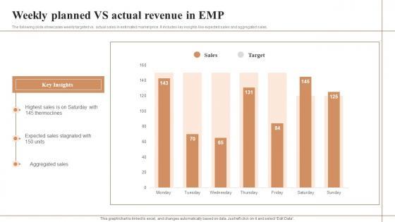 The following slide showcases weekly targeted vs. actual sales in estimated market price. It includes key insights like expected sales and aggregated sales. Showcasing this set of slides titled Weekly Planned Vs Actual Revenue In Emp Background Pdf The topics addressed in these templates are Key Insights, Weekly Planned, Actual Revenue All the content presented in this PPT design is completely editable. Download it and make adjustments in color, background, font etc. as per your unique business setting. The following slide showcases weekly targeted vs. actual sales in estimated market price. It includes key insights like expected sales and aggregated sales.