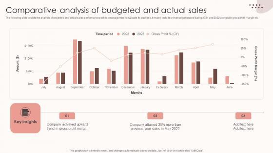 The following slide depicts the analysis of projected and actual sales performance post risk management to evaluate its success. It mainly includes revenue generated during 2022 and 2023 along with gross profit margin etc. Make sure to capture your audiences attention in your business displays with our gratis customizable Mitigating Sales Risks With Strategic Action Planning Comparative Analysis Of Budgeted And Actual Sales Designs PDF. These are great for business strategies, office conferences, capital raising or task suggestions. If you desire to acquire more customers for your tech business and ensure they stay satisfied, create your own sales presentation with these plain slides.