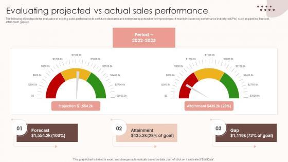 The following slide depicts the evaluation of existing sales performance to set future standards and determine opportunities for improvement. It mainly includes key performance indicators KPIs such as pipeline, forecast, attainment, gap etc. The Evaluating Projected Vs Actual Sales Performance Ppt Ideas Template PDF is a compilation of the most recent design trends as a series of slides. It is suitable for any subject or industry presentation, containing attractive visuals and photo spots for businesses to clearly express their messages. This template contains a variety of slides for the user to input data, such as structures to contrast two elements, bullet points, and slides for written information. Slidegeeks is prepared to create an impression.