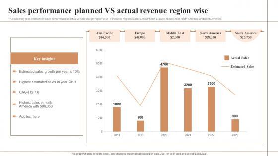 The following slide showcases sales performance of actual vs sales target region wise . It includes regions such as Asia Pacific, Europe, Middle east, North America, and South America. Pitch your topic with ease and precision using this Sales Performance Planned Vs Actual Revenue Region Wise Elements Pdf This layout presents information on Key Insights, Sales Performance, Revenue Region It is also available for immediate download and adjustment. So, changes can be made in the color, design, graphics or any other component to create a unique layout. The following slide showcases sales performance of actual vs sales target region wise . It includes regions such as Asia Pacific, Europe, Middle east, North America, and South America.