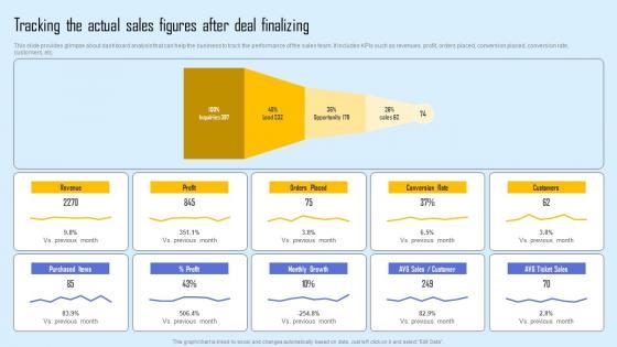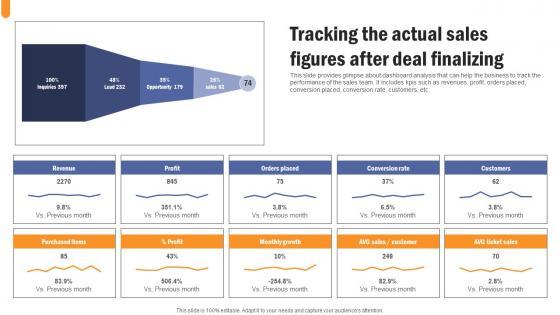 This slide provides glimpse about dashboard analysis that can help the business to track the performance of the sales team. It includes KPIs such as revenues, profit, orders placed, conversion placed, conversion rate, customers, etc. Take your projects to the next level with our ultimate collection of Enhance Customer Retention Tracking The Actual Sales Figures After Deal Finalizing Graphics Pdf. Slidegeeks has designed a range of layouts that are perfect for representing task or activity duration, keeping track of all your deadlines at a glance. Tailor these designs to your exact needs and give them a truly corporate look with your own brand colors they well make your projects stand out from the rest. This slide provides glimpse about dashboard analysis that can help the business to track the performance of the sales team. It includes KPIs such as revenues, profit, orders placed, conversion placed, conversion rate, customers, etc.