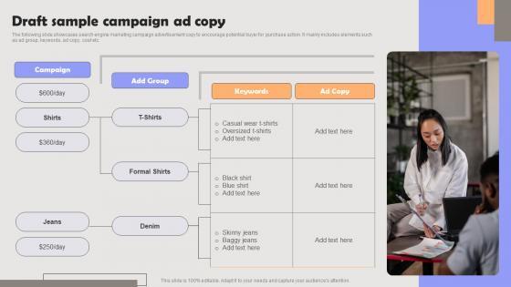 The following slide showcases search engine marketing campaign advertisement copy to encourage potential buyer for purchase action. It mainly includes elements such as ad group, keywords, ad copy, cost etc. Take your projects to the next level with our ultimate collection of Search Engine Marketing Draft Sample Campaign Ad Copy Themes PDF. Slidegeeks has designed a range of layouts that are perfect for representing task or activity duration, keeping track of all your deadlines at a glance. Tailor these designs to your exact needs and give them a truly corporate look with your own brand colors theyll make your projects stand out from the rest.