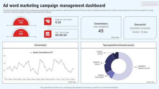 This slide showcases a dashboard for managing ad word campaign to assists marketers in optimizing their ads and PPC performance. It highlights element such as sessions, users, page view per sessions, average time on page, conversions, date period, goals completion and top acquisition channels. Welcome to our selection of the Comprehensive Guide For Sales And Advertising Processes Ad Word Marketing Campaign Management Professional PDF. These are designed to help you showcase your creativity and bring your sphere to life. Planning and Innovation are essential for any business that is just starting out. This collection contains the designs that you need for your everyday presentations. All of our PowerPoints are 100 percent editable, so you can customize them to suit your needs. This multi-purpose template can be used in various situations. Grab these presentation templates today