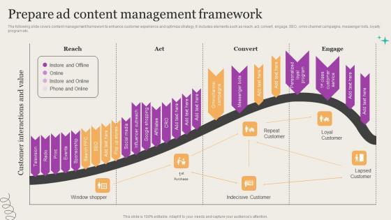 The following slide covers content management framework to enhance customer experience and optimize strategy, It includes elements such as reach, act, convert, engage, SEO, omni channel campaigns, messenger bots, loyalty program etc. Slidegeeks has constructed Mobile Ad Campaign Launch Strategy Prepare Ad Content Management Framework Template Pdf after conducting extensive research and examination. These presentation templates are constantly being generated and modified based on user preferences and critiques from editors. Here, you will find the most attractive templates for a range of purposes while taking into account ratings and remarks from users regarding the content. This is an excellent jumping-off point to explore our content and will give new users an insight into our top-notch PowerPoint Templates. The following slide covers content management framework to enhance customer experience and optimize strategy, It includes elements such as reach, act, convert, engage, SEO, omni channel campaigns, messenger bots, loyalty program etc.