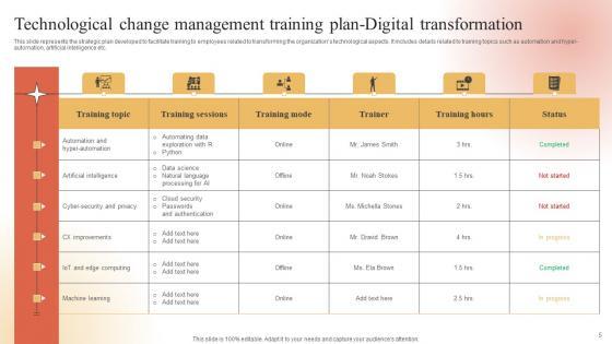This slide represents the strategic plan developed to facilitate training to employees related to transforming the organizations technological aspects. It includes details related to training topics such as automation and hyper automation, artificial intelligence etc. Present like a pro with Technological Change Management Training Adapting To Technological Change Download Pdf Create beautiful presentations together with your team, using our easy to use presentation slides. Share your ideas in real time and make changes on the fly by downloading our templates. So whether you are in the office, on the go, or in a remote location, you can stay in sync with your team and present your ideas with confidence. With Slidegeeks presentation got a whole lot easier. Grab these presentations today. This slide represents the strategic plan developed to facilitate training to employees related to transforming the organizations technological aspects. It includes details related to training topics such as automation and hyper automation, artificial intelligence etc.