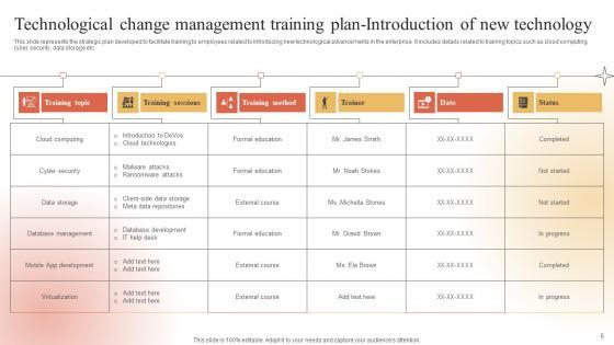 This slide represents the strategic plan developed to facilitate training to employees related to introducing new technological advancements in the enterprise. It includes details related to training topics such as cloud computing, cyber security, data storage etc. Here you can discover an assortment of the finest PowerPoint and Google Slides templates. With these templates, you can create presentations for a variety of purposes while simultaneously providing your audience with an eye catching visual experience. Download Adapting To Technological Change Technological Change Management Training Microsoft Pdf to deliver an impeccable presentation. These templates will make your job of preparing presentations much quicker, yet still, maintain a high level of quality. Slidegeeks has experienced researchers who prepare these templates and write high quality content for you. Later on, you can personalize the content by editing the Adapting To Technological Change Technological Change Management Training Microsoft Pdf. This slide represents the strategic plan developed to facilitate training to employees related to introducing new technological advancements in the enterprise. It includes details related to training topics such as cloud computing, cyber security, data storage etc.
