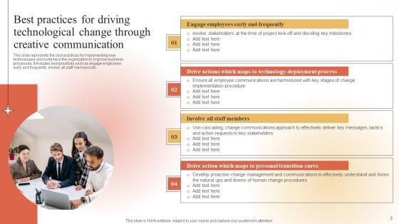 This slide represents the best practices for implementing new technologies and systems in the organization to improve business processes. It includes best practices such as engage employees early and frequently, involve all staff members etc. This Best Practices For Driving Technological Change Adapting To Technological Change Slides Pdf from Slidegeeks makes it easy to present information on your topic with precision. It provides customization options, so you can make changes to the colors, design, graphics, or any other component to create a unique layout. It is also available for immediate download, so you can begin using it right away. Slidegeeks has done good research to ensure that you have everything you need to make your presentation stand out. Make a name out there for a brilliant performance. This slide represents the best practices for implementing new technologies and systems in the organization to improve business processes. It includes best practices such as engage employees early and frequently, involve all staff members etc.