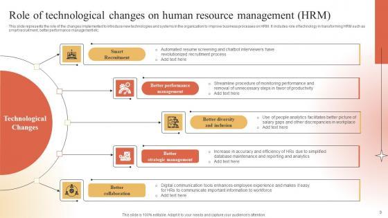 This slide represents the role of the changes implemented to introduce new technologies and systems in the organization to improve business processes on HRM. It includes role of technology in transforming HRM such as smart recruitment, better performance management etc. Want to ace your presentation in front of a live audience Our Role Of Technological Changes Human Adapting To Technological Change Pictures Pdf can help you do that by engaging all the users towards you. Slidegeeks experts have put their efforts and expertise into creating these impeccable powerpoint presentations so that you can communicate your ideas clearly. Moreover, all the templates are customizable, and easy to edit and downloadable. Use these for both personal and commercial use. This slide represents the role of the changes implemented to introduce new technologies and systems in the organization to improve business processes on HRM. It includes role of technology in transforming HRM such as smart recruitment, better performance management etc.