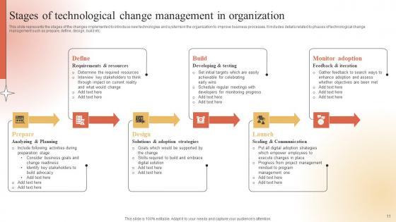 This slide represents the stages of the changes implemented to introduce new technologies and systems in the organization to improve business processes. It includes details related to phases of technological change management such as prepare, define, design, build etc. There are so many reasons you need a Stages Of Technological Change Adapting To Technological Change Ideas Pdf. The first reason is you can not spend time making everything from scratch, Thus, Slidegeeks has made presentation templates for you too. You can easily download these templates from our website easily. This slide represents the stages of the changes implemented to introduce new technologies and systems in the organization to improve business processes. It includes details related to phases of technological change management such as prepare, define, design, build etc.