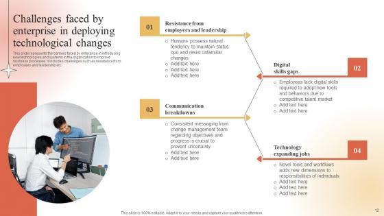 This slide represents the barriers faced by enterprise in introducing new technologies and systems in the organization to improve business processes. It includes challenges such as resistance from employees and leadership etc. Do you know about Slidesgeeks Challenges Faced By Enterprise Deploying Adapting To Technological Change Introduction Pdf These are perfect for delivering any kind od presentation. Using it, create PowerPoint presentations that communicate your ideas and engage audiences. Save time and effort by using our pre designed presentation templates that are perfect for a wide range of topic. Our vast selection of designs covers a range of styles, from creative to business, and are all highly customizable and easy to edit. Download as a PowerPoint template or use them as Google Slides themes. This slide represents the barriers faced by enterprise in introducing new technologies and systems in the organization to improve business processes. It includes challenges such as resistance from employees and leadership etc.