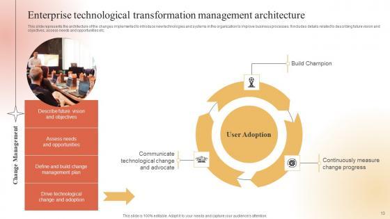 This slide represents the architecture of the changes implemented to introduce new technologies and systems in the organization to improve business processes. It includes details related to describing future vision and objectives, assess needs and opportunities etc. Find a pre designed and impeccable Enterprise Technological Transformation Adapting To Technological Change Themes Pdf. The templates can ace your presentation without additional effort. You can download these easy to edit presentation templates to make your presentation stand out from others. So, what are you waiting for Download the template from Slidegeeks today and give a unique touch to your presentation. This slide represents the architecture of the changes implemented to introduce new technologies and systems in the organization to improve business processes. It includes details related to describing future vision and objectives, assess needs and opportunities etc.