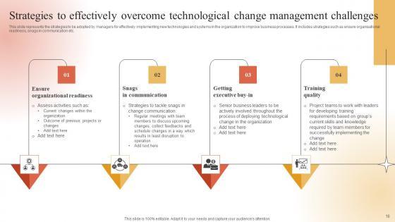 This slide represents the strategies to be adopted by managers for effectively implementing new technologies and systems in the organization to improve business processes. It includes strategies such as ensure organisational readiness, snags in communication etc. Get a simple yet stunning designed Strategies To Effectively Overcome Technological Adapting To Technological Change Information Pdf. It is the best one to establish the tone in your meetings. It is an excellent way to make your presentations highly effective. So, download this PPT today from Slidegeeks and see the positive impacts. Our easy to edit Strategies To Effectively Overcome Technological Adapting To Technological Change Information Pdf can be your go to option for all upcoming conferences and meetings. So, what are you waiting for Grab this template today. This slide represents the strategies to be adopted by managers for effectively implementing new technologies and systems in the organization to improve business processes. It includes strategies such as ensure organisational readiness, snags in communication etc.