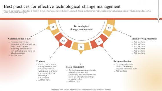 This slide represents the best practices for effectively deploying the changes implemented to introduce new technologies and systems in the organization to improve business processes. It includes best practices such as communication is key, training etc. Take your projects to the next level with our ultimate collection of Best Practices For Effective Technological Adapting To Technological Change Icons Pdf. Slidegeeks has designed a range of layouts that are perfect for representing task or activity duration, keeping track of all your deadlines at a glance. Tailor these designs to your exact needs and give them a truly corporate look with your own brand colors they will make your projects stand out from the rest This slide represents the best practices for effectively deploying the changes implemented to introduce new technologies and systems in the organization to improve business processes. It includes best practices such as communication is key, training etc.