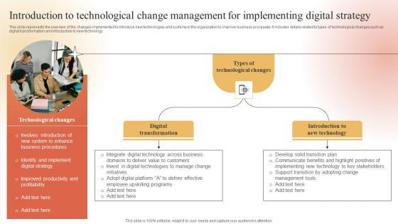 This slide represents the overview of the changes implemented to introduce new technologies and systems in the organization to improve business processes. It includes details related to types of technological changes such as digital transformation and introduction to new technology. Create an editable Introduction To Technological Change Adapting To Technological Change Designs Pdf that communicates your idea and engages your audience. Whether you are presenting a business or an educational presentation, pre designed presentation templates help save time. Introduction To Technological Change Adapting To Technological Change Designs Pdf is highly customizable and very easy to edit, covering many different styles from creative to business presentations. Slidegeeks has creative team members who have crafted amazing templates. So, go and get them without any delay. This slide represents the overview of the changes implemented to introduce new technologies and systems in the organization to improve business processes. It includes details related to types of technological changes such as digital transformation and introduction to new technology.