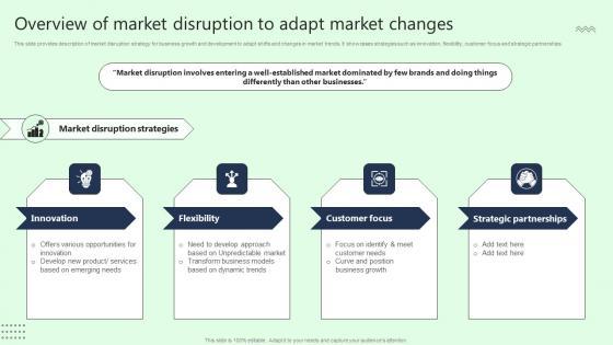 This slide provides description of market disruption strategy for business growth and development to adapt shifts and changes in market trends. It showcases strategies such as innovation, flexibility, customer focus and strategic partnerships. Make sure to capture your audiences attention in your business displays with our gratis customizable Designing Strategies For Company Growth And Success Overview Of Market Disruption To Adapt Market Changes Structure PDF. These are great for business strategies, office conferences, capital raising or task suggestions. If you desire to acquire more customers for your tech business and ensure they stay satisfied, create your own sales presentation with these plain slides.