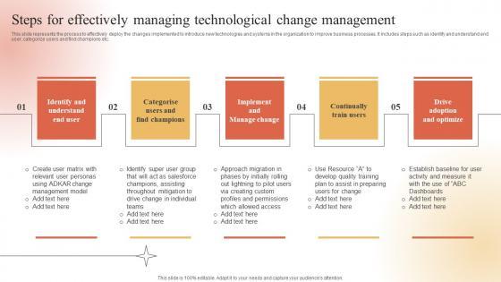 This slide represents the process to effectively deploy the changes implemented to introduce new technologies and systems in the organization to improve business processes. It includes steps such as identify and understand end user, categorize users and find champions etc. Do you have to make sure that everyone on your team knows about any specific topic I yes, then you should give Steps For Effectively Managing Technological Adapting To Technological Change Microsoft Pdf a try. Our experts have put a lot of knowledge and effort into creating this impeccable Steps For Effectively Managing Technological Adapting To Technological Change Microsoft Pdf. You can use this template for your upcoming presentations, as the slides are perfect to represent even the tiniest detail. You can download these templates from the Slidegeeks website and these are easy to edit. So grab these today This slide represents the process to effectively deploy the changes implemented to introduce new technologies and systems in the organization to improve business processes. It includes steps such as identify and understand end user, categorize users and find champions etc.