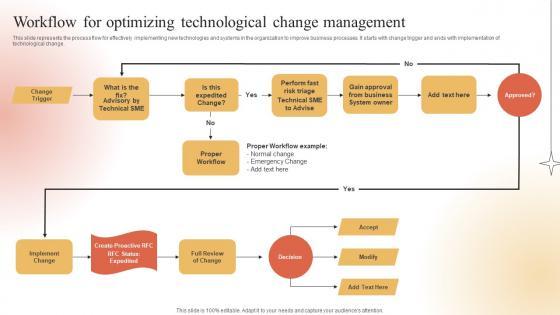 This slide represents the process flow for effectively implementing new technologies and systems in the organization to improve business processes. It starts with change trigger and ends with implementation of technological change. Whether you have daily or monthly meetings, a brilliant presentation is necessary. Workflow For Optimizing Technological Adapting To Technological Change Template Pdf can be your best option for delivering a presentation. Represent everything in detail using Workflow For Optimizing Technological Adapting To Technological Change Template Pdf and make yourself stand out in meetings. The template is versatile and follows a structure that will cater to your requirements. All the templates prepared by Slidegeeks are easy to download and edit. Our research experts have taken care of the corporate themes as well. So, give it a try and see the results. This slide represents the process flow for effectively implementing new technologies and systems in the organization to improve business processes. It starts with change trigger and ends with implementation of technological change.