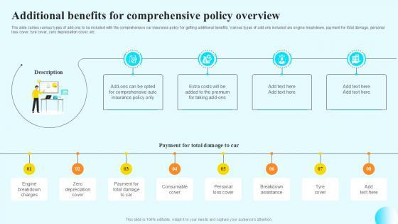 The slide carries various types of add-ons to be included with the comprehensive car insurance policy for getting additional benefits. Various types of add-ons included are engine breakdown, payment for total damage, personal loss cover, tyre cover, zero depreciation cover, etc. Find a pre-designed and impeccable Additional Benefits For Comprehensive Steps By Step Guide For Claiming Car PPT Template. The templates can ace your presentation without additional effort. You can download these easy-to-edit presentation templates to make your presentation stand out from others. So, what are you waiting for Download the template from Slidegeeks today and give a unique touch to your presentation. The slide carries various types of add-ons to be included with the comprehensive car insurance policy for getting additional benefits. Various types of add-ons included are engine breakdown, payment for total damage, personal loss cover, tyre cover, zero depreciation cover, etc.