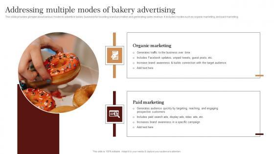 This slide provides glimpse about various modes to advertise bakery business for boosting brand promotion and generating sales revenue. It includes modes such as organic marketing, and paid marketing.Formulating a presentation can take up a lot of effort and time, so the content and message should always be the primary focus. The visuals of the PowerPoint can enhance the presenters message, so our Addressing Multiple Modes Of Bakery Strategic Advertising Plan For Bakehouse Clipart Pdf was created to help save time. Instead of worrying about the design, the presenter can concentrate on the message while our designers work on creating the ideal templates for whatever situation is needed. Slidegeeks has experts for everything from amazing designs to valuable content, we have put everything into Addressing Multiple Modes Of Bakery Strategic Advertising Plan For Bakehouse Clipart Pdf This slide provides glimpse about various modes to advertise bakery business for boosting brand promotion and generating sales revenue. It includes modes such as organic marketing, and paid marketing.