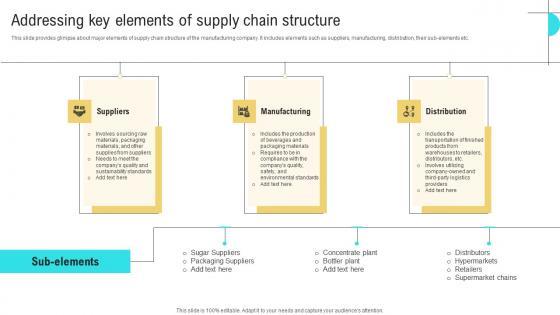 This slide provides glimpse about major elements of supply chain structure of the manufacturing company. It includes elements such as suppliers, manufacturing, distribution, their sub elements etc. Boost your pitch with our creative Addressing Key Elements Supply Operations Strategy Improve Business Productivity Information Pdf. Deliver an awe inspiring pitch that will mesmerize everyone. Using these presentation templates you will surely catch everyones attention. You can browse the ppts collection on our website. We have researchers who are experts at creating the right content for the templates. So you do not have to invest time in any additional work. Just grab the template now and use them. This slide provides glimpse about major elements of supply chain structure of the manufacturing company. It includes elements such as suppliers, manufacturing, distribution, their sub elements etc.