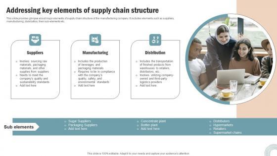 This slide provides glimpse about major elements of supply chain structure of the manufacturing company. It includes elements such as suppliers, manufacturing, distribution, their sub elements etc. Boost your pitch with our creative Addressing Key Elements Business Performance Optimization New Operations Strategy Topics Pdf. Deliver an awe inspiring pitch that will mesmerize everyone. Using these presentation templates you will surely catch everyones attention. You can browse the ppts collection on our website. We have researchers who are experts at creating the right content for the templates. So you do not have to invest time in any additional work. Just grab the template now and use them. This slide provides glimpse about major elements of supply chain structure of the manufacturing company. It includes elements such as suppliers, manufacturing, distribution, their sub elements etc.