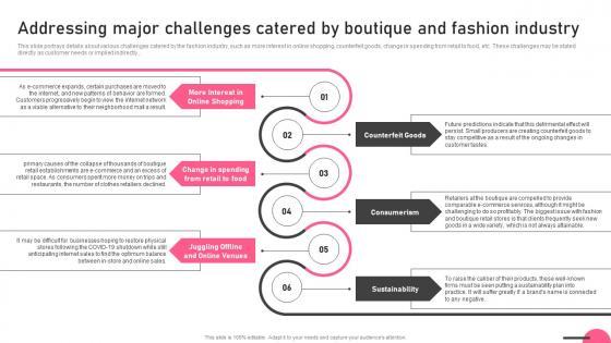 This slide portrays details about various challenges catered by the fashion industry, such as more interest in online shopping, counterfeit goods, change in spending from retail to food, etc. These challenges may be stated directly as customer needs or implied indirectly. Find a pre-designed and impeccable Addressing Major Challenges Catered By Boutique And Boutique Business Formats Pdf. The templates can ace your presentation without additional effort. You can download these easy-to-edit presentation templates to make your presentation stand out from others. So, what are you waiting for Download the template from Slidegeeks today and give a unique touch to your presentation. This slide portrays details about various challenges catered by the fashion industry, such as more interest in online shopping, counterfeit goods, change in spending from retail to food, etc. These challenges may be stated directly as customer needs or implied indirectly.