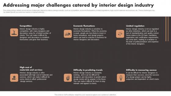 This slide portrays details about various challenges catered by interior design industry, such as competition, economic fluctuations, limited regulations, high cost of materials and services, etc. These challenges may be stated directly as customer needs or implied indirectly. Are you in need of a template that can accommodate all of your creative concepts This one is crafted professionally and can be altered to fit any style. Use it with Google Slides or PowerPoint. Include striking photographs, symbols, depictions, and other visuals. Fill, move around, or remove text boxes as desired. Test out color palettes and font mixtures. Edit and save your work, or work with colleagues. Download Addressing Major Challenges Catered By Interior Design Industry Luxury Interior Design Clipart Pdf and observe how to make your presentation outstanding. Give an impeccable presentation to your group and make your presentation unforgettable. This slide portrays details about various challenges catered by interior design industry, such as competition, economic fluctuations, limited regulations, high cost of materials and services, etc. These challenges may be stated directly as customer needs or implied indirectly.