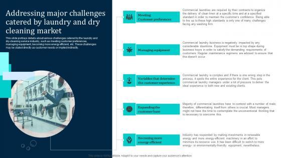 This slide portrays details about various challenges catered by the laundry and dry-cleaning service industry, such as meeting customer preferences, managing equipment, becoming more energy efficient, etc. These challenges may be stated directly as customer needs or implied indirectly.Find a pre-designed and impeccable Addressing Major Challenges Catered By Laundromat Business Plan Go To Market Background Pdf The templates can ace your presentation without additional effort. You can download these easy-to-edit presentation templates to make your presentation stand out from others. So, what are you waiting for Download the template from Slidegeeks today and give a unique touch to your presentation. This slide portrays details about various challenges catered by the laundry and dry cleaning service industry, such as meeting customer preferences, managing equipment, becoming more energy efficient, etc. These challenges may be stated directly as customer needs or implied indirectly.