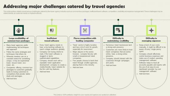 This slide portrays details about various challenges catered by the travel agency industry such as common tour packages, inefficient travel software, competition, credibility and expense management. These challenges may be stated directly as customer needs or implied indirectly. From laying roadmaps to briefing everything in detail, our templates are perfect for you. You can set the stage with your presentation slides. All you have to do is download these easy-to-edit and customizable templates. Addressing Major Challenges Catered By Travel Agencies Vacation Planning Business Icons Pdf will help you deliver an outstanding performance that everyone would remember and praise you for. Do download this presentation today. This slide portrays details about various challenges catered by the travel agency industry such as common tour packages, inefficient travel software, competition, credibility and expense management. These challenges may be stated directly as customer needs or implied indirectly.