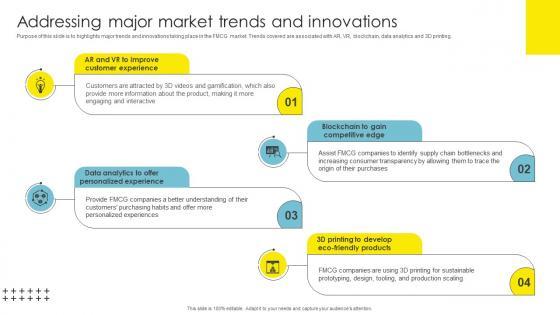 Purpose of this slide is to highlights major trends and innovations taking place in the FMCG market. Trends covered are associated with AR, VR, blockchain, data analytics and 3D printing. Find a pre designed and impeccable Addressing Major Market Trends And Strategic Brand Management Ideas Pdf. The templates can ace your presentation without additional effort. You can download these easy to edit presentation templates to make your presentation stand out from others. So, what are you waiting for Download the template from Slidegeeks today and give a unique touch to your presentation. Purpose of this slide is to highlights major trends and innovations taking place in the FMCG market. Trends covered are associated with AR, VR, blockchain, data analytics and 3D printing.
