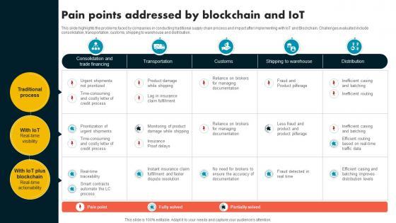 This slide highlights the problems faced by companies in conducting traditional supply chain process and impact after implementing with IoT and Blockchain. Challenges evaluated include consolidation, transportation, customs, shipping to warehouse and distribution. Coming up with a presentation necessitates that the majority of the effort goes into the content and the message you intend to convey. The visuals of a PowerPoint presentation can only be effective if it supplements and supports the story that is being told. Keeping this in mind our experts created Pain Points Addressed By Blockchain And Iot Supply Chain Evolution Harnessing The Power BCT SS V to reduce the time that goes into designing the presentation. This way, you can concentrate on the message while our designers take care of providing you with the right template for the situation. This slide highlights the problems faced by companies in conducting traditional supply chain process and impact after implementing with IoT and Blockchain. Challenges evaluated include consolidation, transportation, customs, shipping to warehouse and distribution.