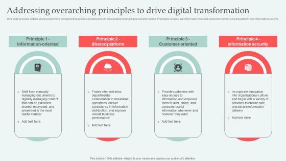 This slide provides details about overarching principles that will assist enterprises in successfully driving digital transformation. Principles covered are information focused, customer centric, shared platform and information security. Boost your pitch with our creative Addressing Overarching Principles To Drive Digital Transformation Designs PDF. Deliver an awe inspiring pitch that will mesmerize everyone. Using these presentation templates you will surely catch everyones attention. You can browse the ppts collection on our website. We have researchers who are experts at creating the right content for the templates. So you do not have to invest time in any additional work. Just grab the template now and use them.
