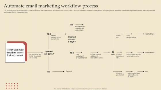 The following slide depicts improved email workflow to automate actions and reduce time and resources. It includes elements such as verifying details, accepting email, resending content, linking contact details, delivering relevant resources, informing sales team etc. This Automate Email Describing Business Performance Administration Goals Clipart Pdf is perfect for any presentation, be it in front of clients or colleagues. It is a versatile and stylish solution for organizing your meetings. The Automate Email Describing Business Performance Administration Goals Clipart Pdf features a modern design for your presentation meetings. The adjustable and customizable slides provide unlimited possibilities for acing up your presentation. Slidegeeks has done all the homework before launching the product for you. So, do not wait, grab the presentation templates today The following slide depicts improved email workflow to automate actions and reduce time and resources. It includes elements such as verifying details, accepting email, resending content, linking contact details, delivering relevant resources, informing sales team etc.