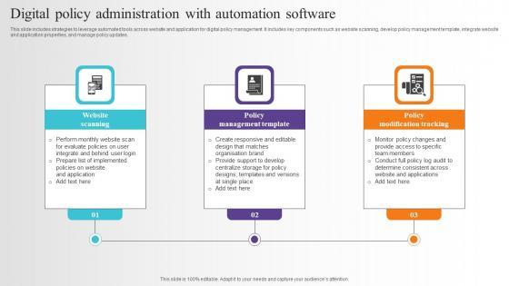 This slide includes strategies to leverage automated tools across website and application for digital policy management. It includes key components such as website scanning, develop policy management template, integrate website and application properties, and manage policy updates. Showcasing this set of slides titled Digital Policy Administration With Automation Software Infographics Pdf. The topics addressed in these templates are Policy Management Template, Integrate Website, Application Properties. All the content presented in this PPT design is completely editable. Download it and make adjustments in color, background, font etc. as per your unique business setting. This slide includes strategies to leverage automated tools across website and application for digital policy management. It includes key components such as website scanning, develop policy management template, integrate website and application properties, and manage policy updates.