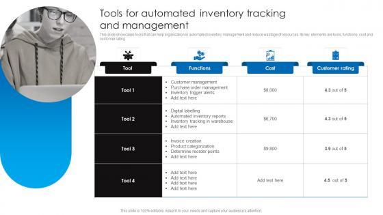 This slide showcases tools that can help organization in automated inventory management and reduce wastage of resources. Its key elements are tools, functions, cost and customer rating. Slidegeeks is one of the best resources for PowerPoint templates. You can download easily and regulate Tools Automated Tracking Inventory Administration Techniques Enhanced Stock Accuracy Designs Pdf for your personal presentations from our wonderful collection. A few clicks is all it takes to discover and get the most relevant and appropriate templates. Use our Templates to add a unique zing and appeal to your presentation and meetings. All the slides are easy to edit and you can use them even for advertisement purposes. This slide showcases tools that can help organization in automated inventory management and reduce wastage of resources. Its key elements are tools, functions, cost and customer rating.