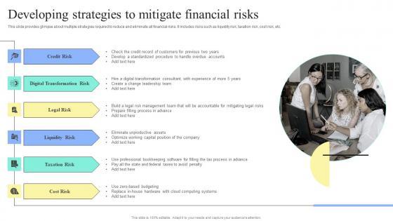 This slide provides glimpse about multiple strategies required to reduce and eliminate all financial risks. It includes risks such as liquidity risk, taxation risk, cost risk, etc. This Strategic Financial Planning And Administration Developing Strategies To Mitigate Financial Portrait PDF is perfect for any presentation, be it in front of clients or colleagues. It is a versatile and stylish solution for organizing your meetings. The Strategic Financial Planning And Administration Developing Strategies To Mitigate Financial Portrait PDF features a modern design for your presentation meetings. The adjustable and customizable slides provide unlimited possibilities for acing up your presentation. Slidegeeks has done all the homework before launching the product for you. So, do not wait, grab the presentation templates today This slide provides glimpse about multiple strategies required to reduce and eliminate all financial risks. It includes risks such as liquidity risk, taxation risk, cost risk, etc.