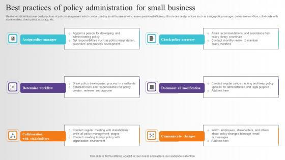 Mentioned slide illustrates best practices of policy management which can be used by small business to increase operational efficiency. It includes best practices such as assign policy manager, determine workflow, collaborate with stakeholders, check policy accuracy, etc. Showcasing this set of slides titled Best Practices Of Policy Administration For Small Business Background Pdf. The topics addressed in these templates are Assign Policy Manager, Determine Workflow, Check Policy Accuracy. All the content presented in this PPT design is completely editable. Download it and make adjustments in color, background, font etc. as per your unique business setting. Mentioned slide illustrates best practices of policy management which can be used by small business to increase operational efficiency. It includes best practices such as assign policy manager, determine workflow, collaborate with stakeholders, check policy accuracy, etc.
