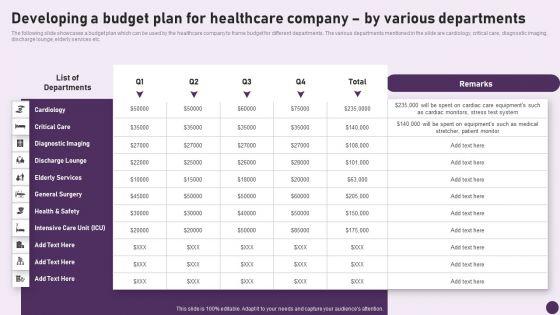 The following slide showcases a budget plan which can be used by the healthcare company to frame budget for different departments. The various departments mentioned in the slide are cardiology, critical care, diagnostic imaging, discharge lounge, elderly services etc. Make sure to capture your audiences attention in your business displays with our gratis customizable Guide To Healthcare Services Administration Developing A Budget Plan For Healthcare Company Various Download PDF. These are great for business strategies, office conferences, capital raising or task suggestions. If you desire to acquire more customers for your tech business and ensure they stay satisfied, create your own sales presentation with these plain slides.