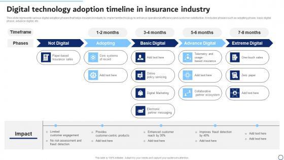 This slide represents various digital adoption phases that helps insurance industry to implement technology to enhance operational efficiency and customer satisfaction. It includes phases such as adopting phase, basic digital phase, advance digital, etc. Pitch your topic with ease and precision using this Digital Technology Adoption Timeline In Insurance Industry Microsoft Pdf. This layout presents information on Not Digital, Adopting, Basic Digital, Advance Digital. It is also available for immediate download and adjustment. So, changes can be made in the color, design, graphics or any other component to create a unique layout. This slide represents various digital adoption phases that helps insurance industry to implement technology to enhance operational efficiency and customer satisfaction. It includes phases such as adopting phase, basic digital phase, advance digital, etc.